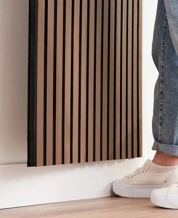 • High-quality American oak veneer in premium and oiled finishes • Recycled felt backing absorbs sound and reduces echo • Modern slat design for a refined look